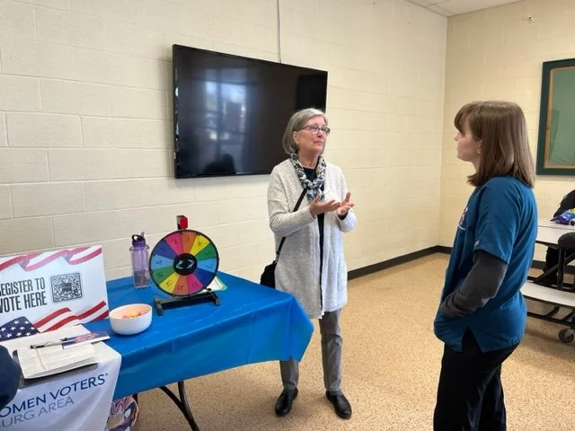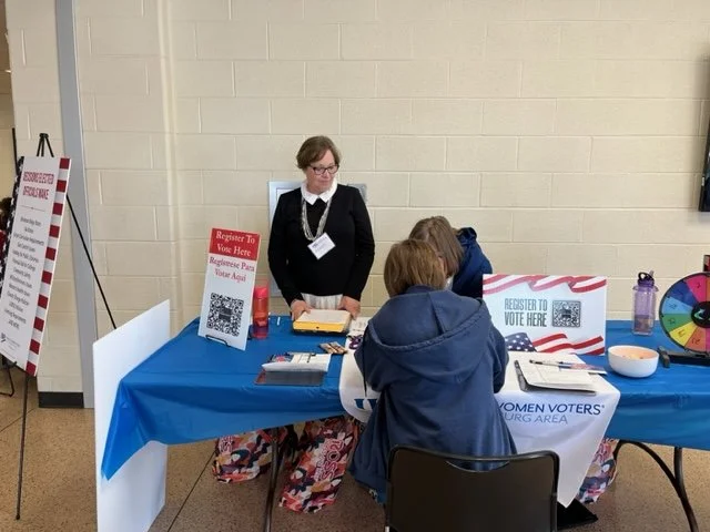 Late March saw LWV HA members, Chris and Sue, registering voters on the campus. 35 students interacted with us, 7 of whom completed voter registration forms. One form was handed out. Quite a few GOTV (Get Out The Vote) reminder cards and Vote411 voting plan cards were taken.